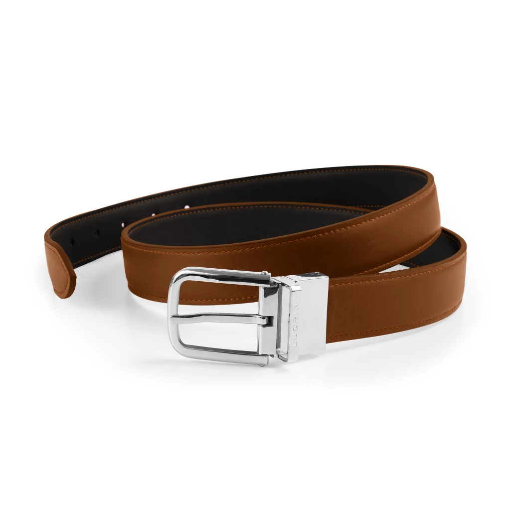 This is the flagship of the belts collection by Lucrin - the exquisite reversible leather belt for men & women. You can get a superb belt of two distinct or matching colours : black & navy blue, tan & green, are some examples that you can choose, as per your wish, as per your outfits. You just need to pull and turn the belt buckle to swap between the two colours. The magnificent silver coloured buckle is nickel-free and comes in two sizes, depending on the loop for the belt. The belt leather can be customised in terms of its length (see the size guide), a great choice of leathers & colours, contrasting thread shades, and you may even ask for unique initials engraving at the belt’s end.