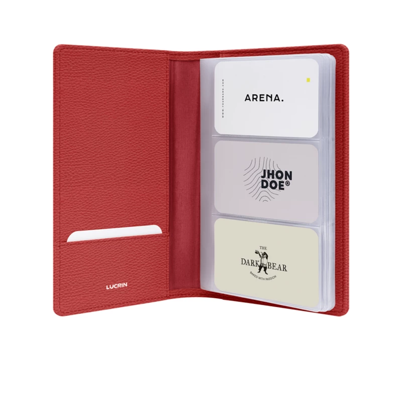 Your professional network is one of your most valuable assets, and it deserves to be kept with care. This business card organiser in fine leather keeps every contact neatly arranged and easy to consult, with 18 transparent sleeves designed to hold up to 54 cards — or up to 108 when used on both sides. At your desk, in meetings, or on the move, every detail stays within reach. Designed for those who value precision and clarity, this leather business card holder allows you to review contacts at a glance. The left interior cover features a dedicated slot for your own business cards, keeping them ready whenever you need to share them. Each sleeve protects your cards, while the slim format slips naturally into your workspace or bag. Choose the leather, colour and stitching, then add a discreet monogram. A refined companion for your professional journey. Make this LUCRIN business card organiser unmistakably yours.