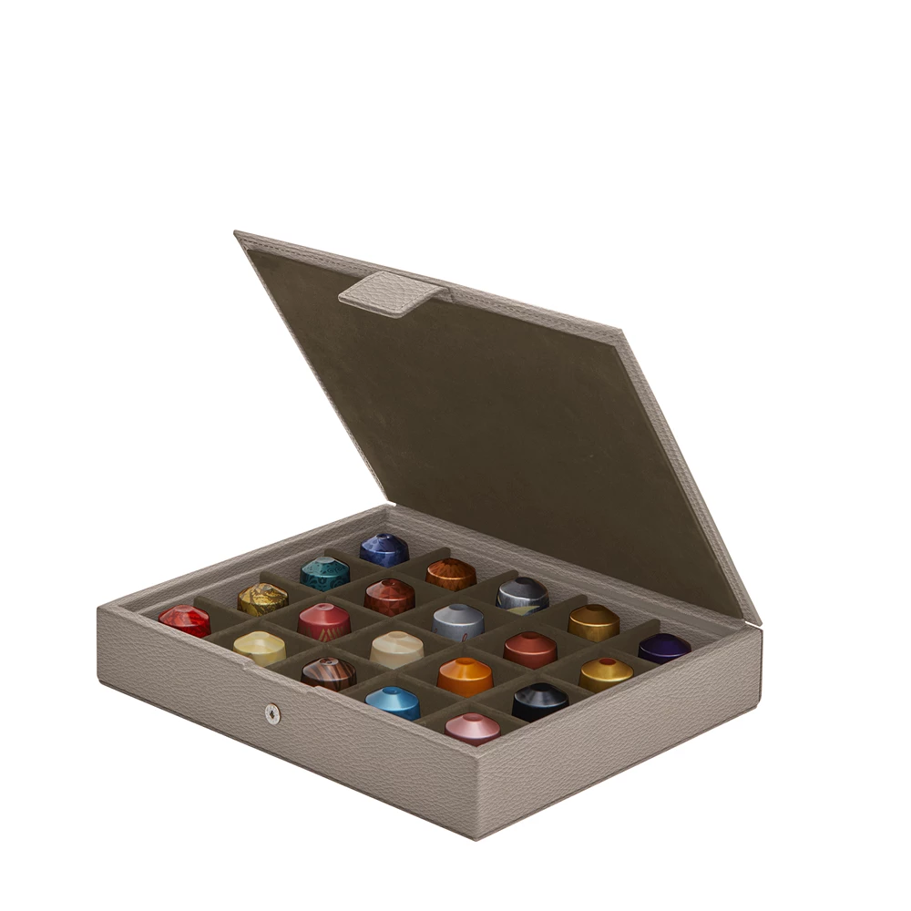 This sumptuous presentation box for Nespresso capsules is made in authentic leather. Welcome your guests by proposing them one of the 20 capsules on display in this beautiful coffee capsules box.